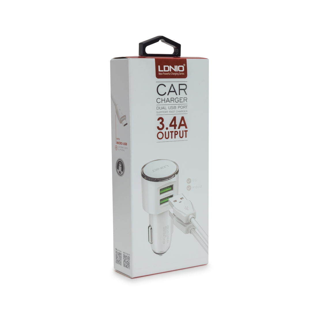 Автомобильное зарядное устройство LDNIO DL-C29 — 2×USB + кабель Lightning, белый
