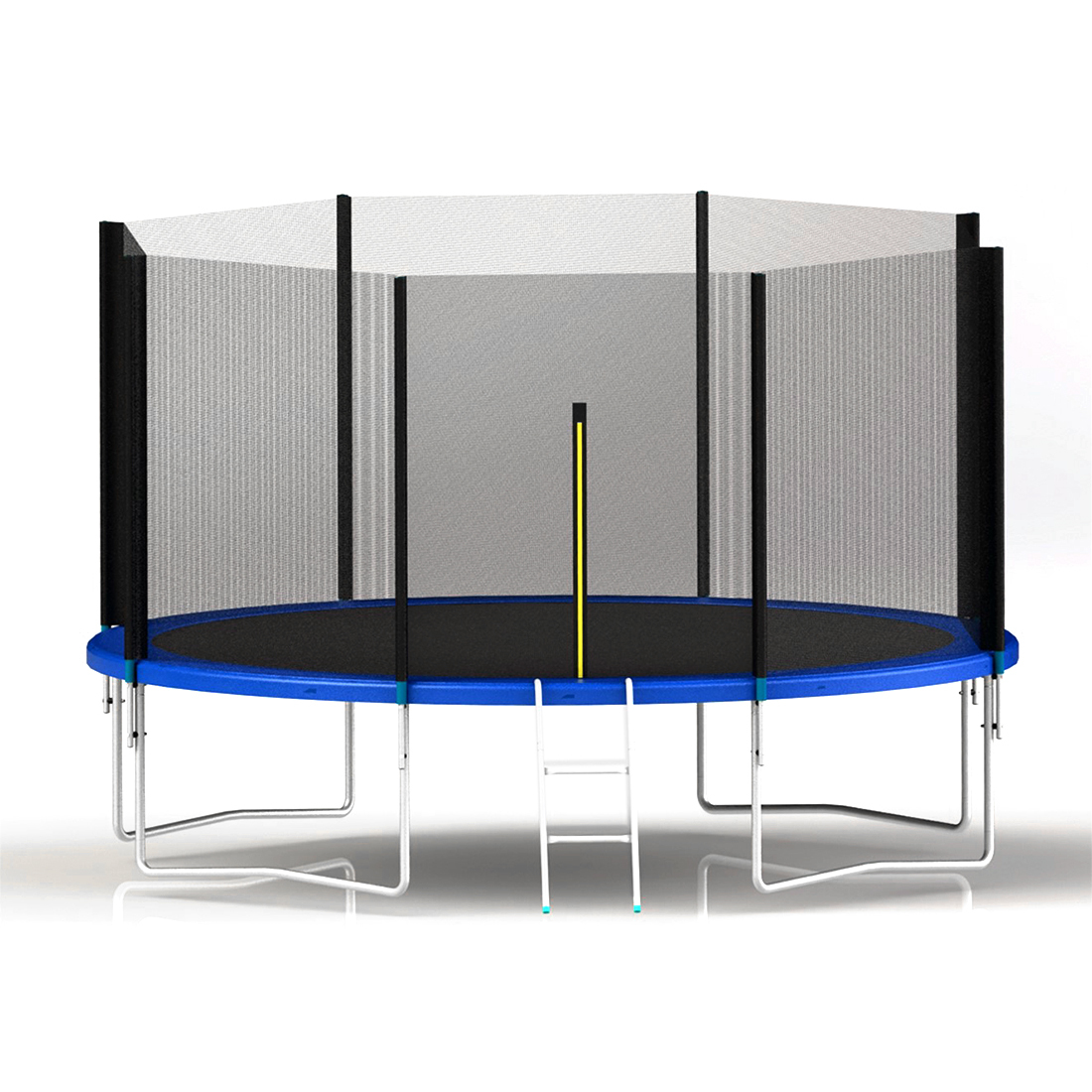 По периметру батута предусмотрена мягкая накладка синего цвета, которая скрывает металлические элементы конструкции, обеспечивая комфортное и безопасное использование.