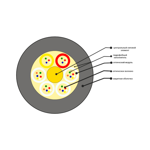 Кабель содержит сердечник модульной конструкции с центральным силовым элементом из стеклопластикового прутка, вокруг которого скручены оптические модули методом правильной SZ- скрутки вокруг центрального силового элемента – стеклопластикого прутка. Внутри оптических модулей свободно уложены оптические волокна. Свободное пространство внутри оптических модулей и межмодульное пространство заполнено гидрофобным заполнителем. Сердечник скреплен нитями. На сердечник наложена ПЭТ-лента, закрепленная нитью. Поверх сердечника накладывается оболочка из полиэтилена высокой плотности.