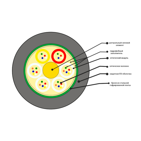 Кабель содержит сердечник модульной конструкции с центральным силовым элементом из стеклопластикового прутка, вокруг которого скручены оптические модули методом правильной SZ-скрутки. Внутри оптических модулей свободно уложены оптические волокна. Свободное пространство внутри оптических модулей и межмодульное пространство заполнено гидрофобным заполнителем. Сердечник скреплен нитями. На сердечниках наложена ПЭТ-лента, закрепленная нитью. Поверх сердечника накладывается броня из стальной гофрированной ламинированной ленты. Свободное пространство между лентой и сердечником заполняются гидрофобным заполнителем. Поверх ленточной брони накладывается полиэтилен высокой плотности.