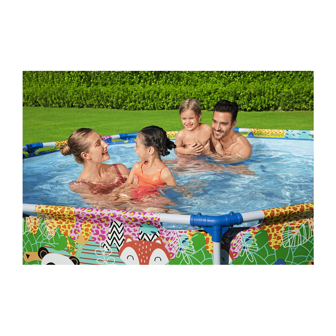 Каркасный бассейн Bestway отличается высокой прочностью и устойчивостью. Чаша выполнена из высококачественного трехслойного ПВХ: два слоя плотного винила и один - стекловолокно для особой прочности. Каркас металлический нержавеющий оцинкованный.Не требует бетонирования и подготовки ямы, все, что нужно, это плоская, горизонтальная площадка. Сезонный бассейн (рекомендуется разбирать на холодное время года) обладает простой конструкцией - может быть легко разобран и собран заново. Время сборки и подключения бассейна не более 30-40 минут.Удобный сливной клапан позволяет присоединить садовый шланг, что дает возможность слить воду в любое место.