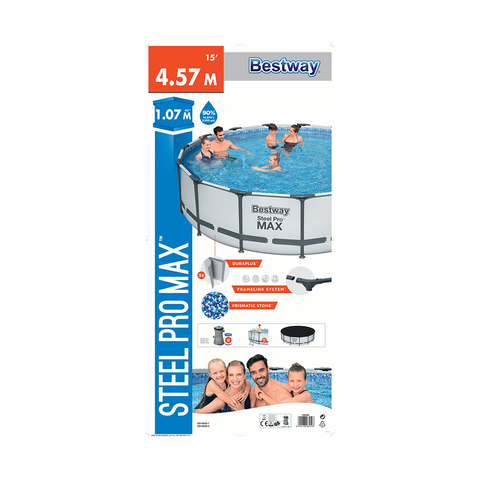 Каркасный бассейн Steel Pro MAX 457 х 107 см, BESTWAY, 56488, Винил, 14970 л., Стальной каркас, Ф-насос 58386 (3028л/ч), Лестница 58335, Тент 58038, Серый, Цветная коробка