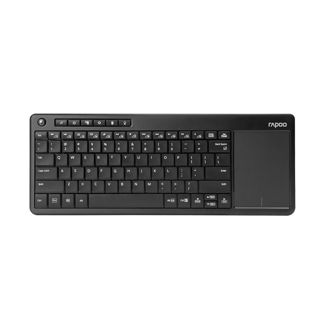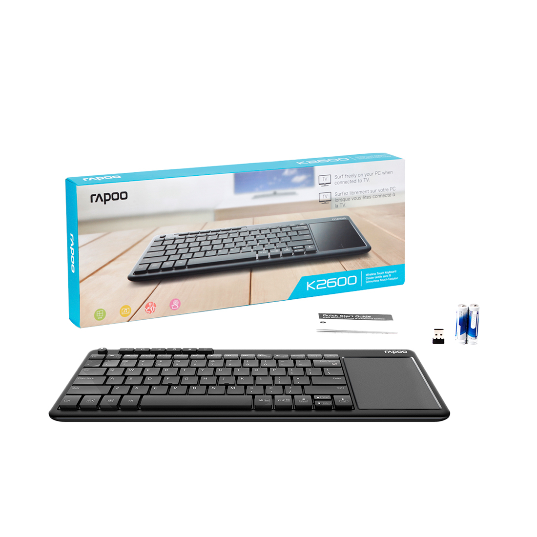 Клавиатура Rapoo K2600 Клавиатура K2600 – это классическая прочная клавиатура. Встроенный тачпад обеспечивает комфортный контроль за медиа-устройствами, будь то телевизоры Smart TV, медиа- или ТВ-приставки. Ее чистый, эргономичный дизайн добавляет стильный штрих к любому столу. K2600 обеспечивает легкий и быстрый доступ ко всем важным мультимедиа-функциям через Fn-клавиши. Беспроводное соединение 2.4 ГГц обеспечивает максимальную свободу без проводов.