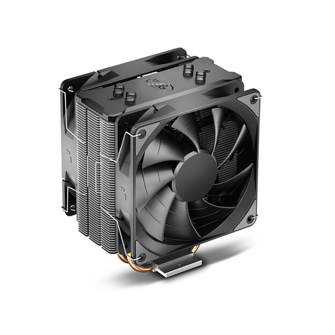 Сама башня довольно стандартная по своему дизайну. Сверху радиатор накрыт черной пластмассовой пластиной с логотипом Deepcool. Радиатор имеет 56 алюминиевых пластин с одинаковой длиной по всей высоте, что позволило увеличить общую площадь поверхности радиатора на 20% по сравнению с GAMMAXX 400. Зазор между алюминиевыми пластинами составляет 1.8 мм.