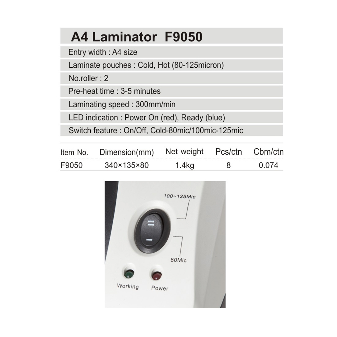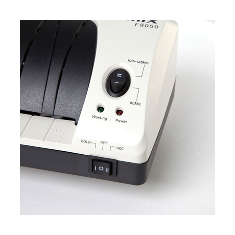 Comix F9050 ламинатор начального уровня для дома офиса. Ламинатор предназначен для работы с пленкой 80, 100 и 125 мкм. Максимальный формат документа А4. Ламинатор прост в управлении и не требует дополнительных настроек. Синий световой сигнал подскажет о готовности к работе через 3-5 минут после включения. Корпус ламинатора не перегревается и безопасен при прикосновении. Ламинатор Comix F9050 позволяет надежно заламинировать документы, презентационные и рекламные материалы, фотографии, грамоты, рисунки, открытки, визитки, инструкции и многое другое. Основные характеристики: - Диапазон плёнок: 80, 100 и 125 мкм. - Скорость ламинирования: 30 см/мин. - Кол-во валов: 2 - Время нагрева: 3-5 мин. - Холодное ламинирование: Да - Горячее ламинирование: Да - Габариты (ДхШхВ): 520*155*116 мм. - Вес: 1,4 кг. - Гарантия: 1 год