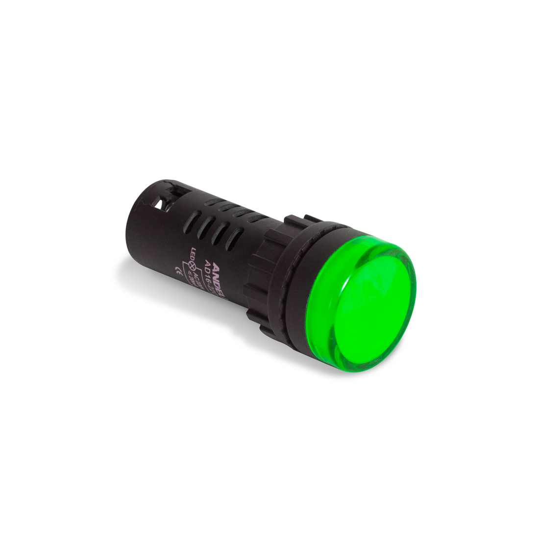 Лампа светодиодная универсальная ANDELI AD16-22D 220V AC/DC (зелёная) Предназначена для индикации наличия напряжения электрической сети, а так же рабочего состояния электротехнического оборудования (нормального, требующего повышенного внимания и аварийного)