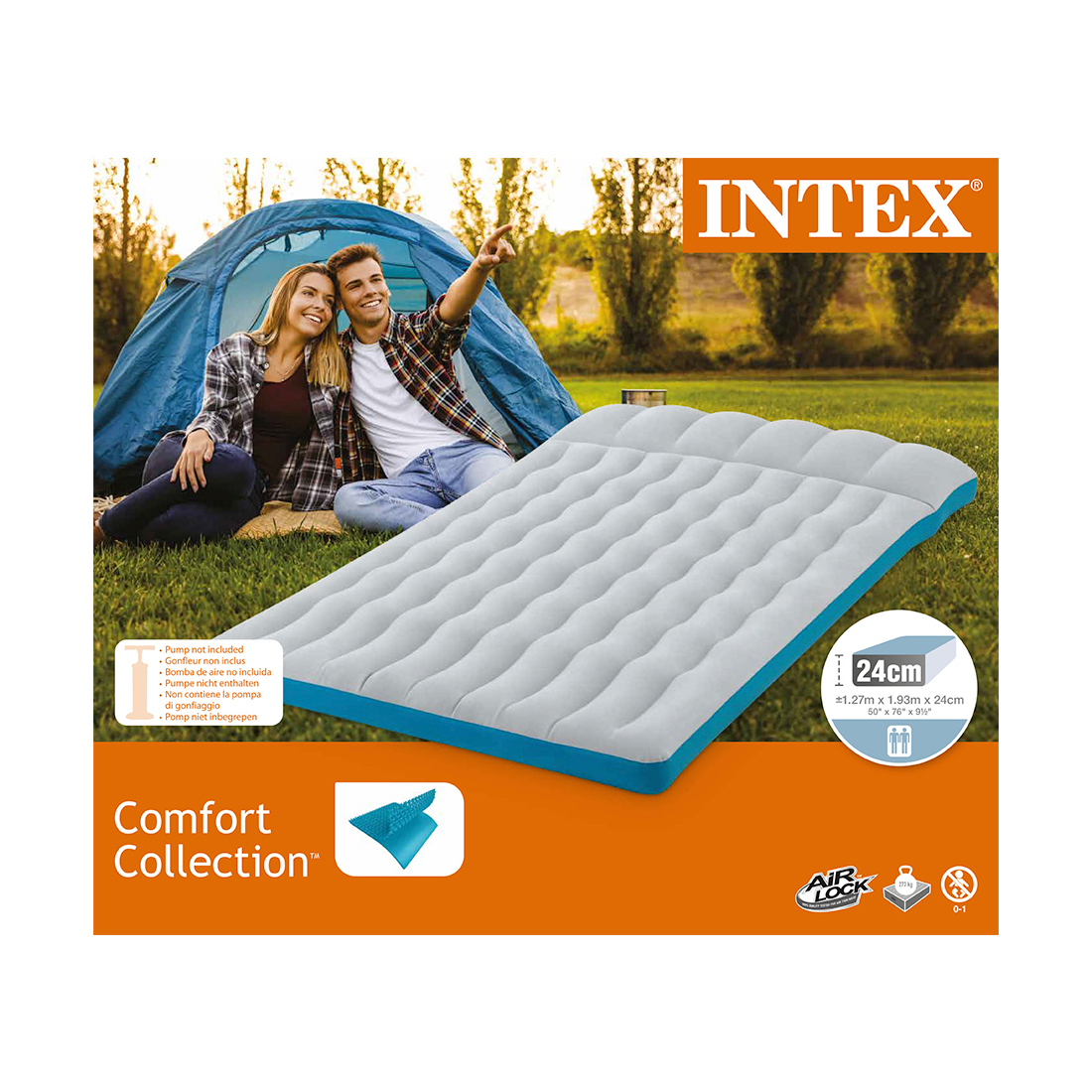 Матрас для кемпинга надувной Camping Mat 193 х 127 х 24 см, INTEX, 67999, Винил, Флокированный верх, Двухслойное дно, Встроенная подушка, Сине-белый, Цветная коробка