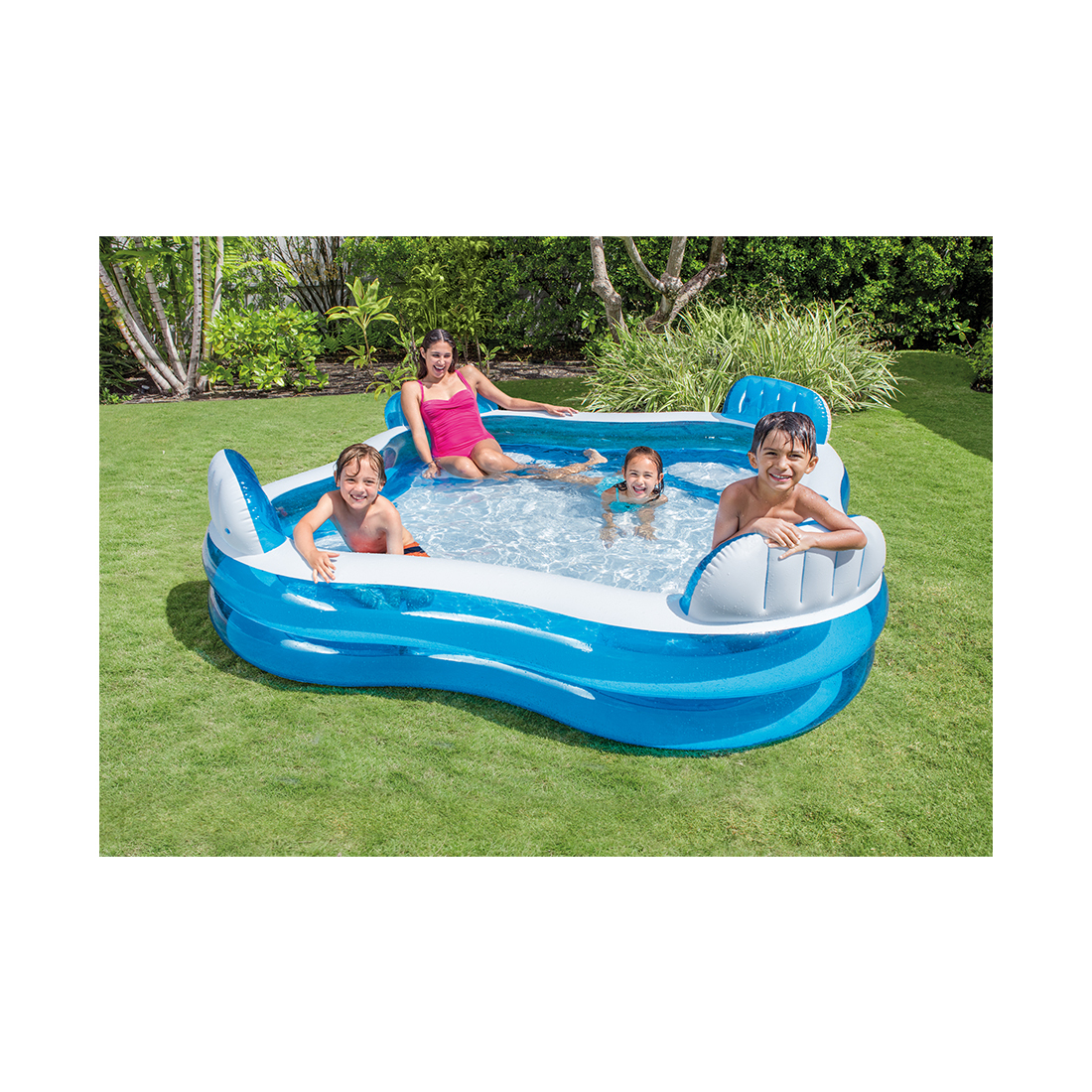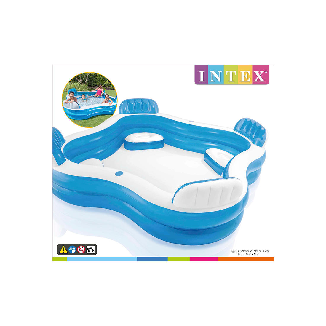 Семейный надувной бассейн Beach Wave 229 х 229 х 66 см, INTEX, 56475NP, Винил, 990 л., 3+, 4 надувных сиденья с спинками, 2 встроенных подстаканника, Сливной клапан, Голубой, Цветная коробка