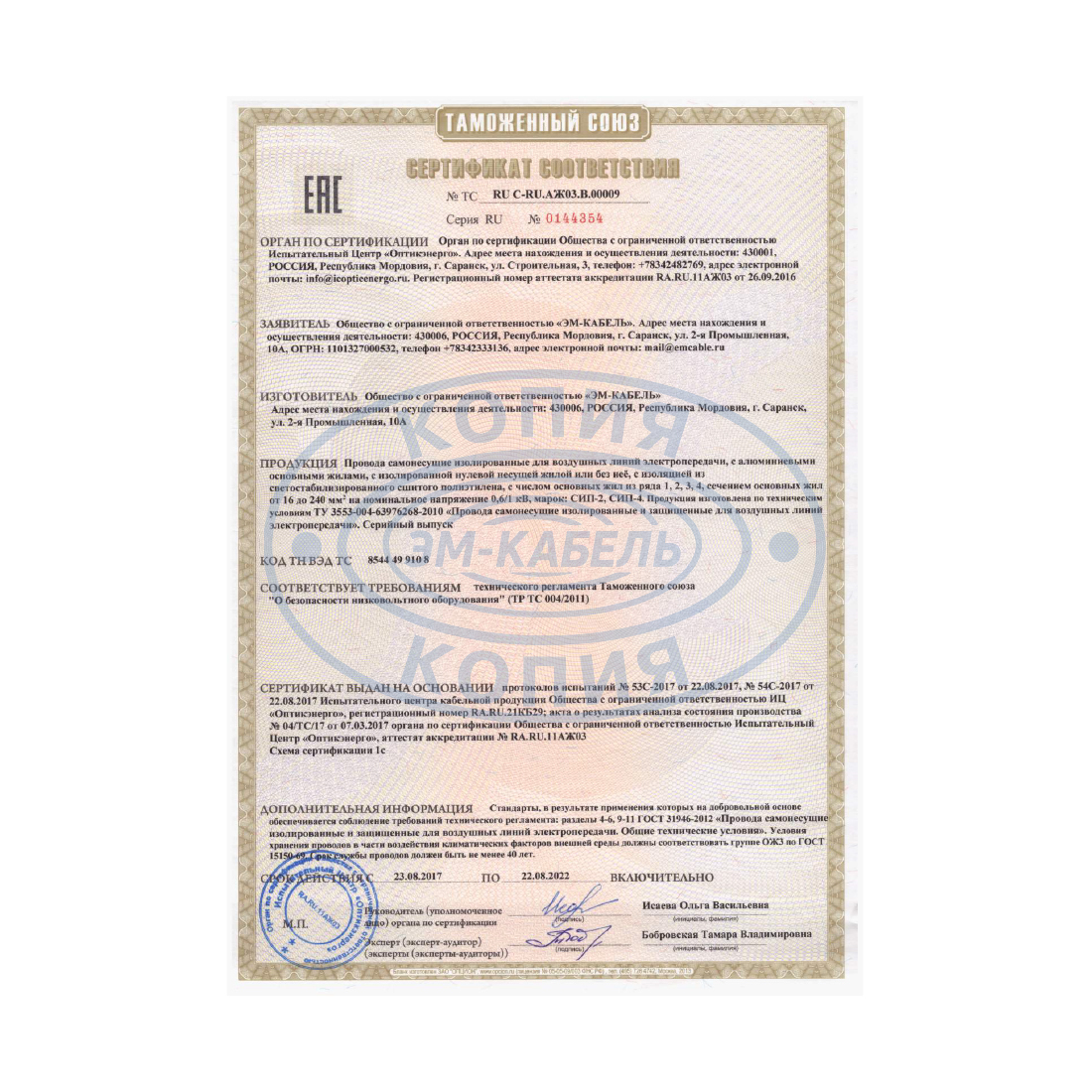 Провод самонесущий изолированный без несущего элемента, с алюминиевыми токопроводящими жилами, с изоляцией из светостабилизированного сшитого ПЭ