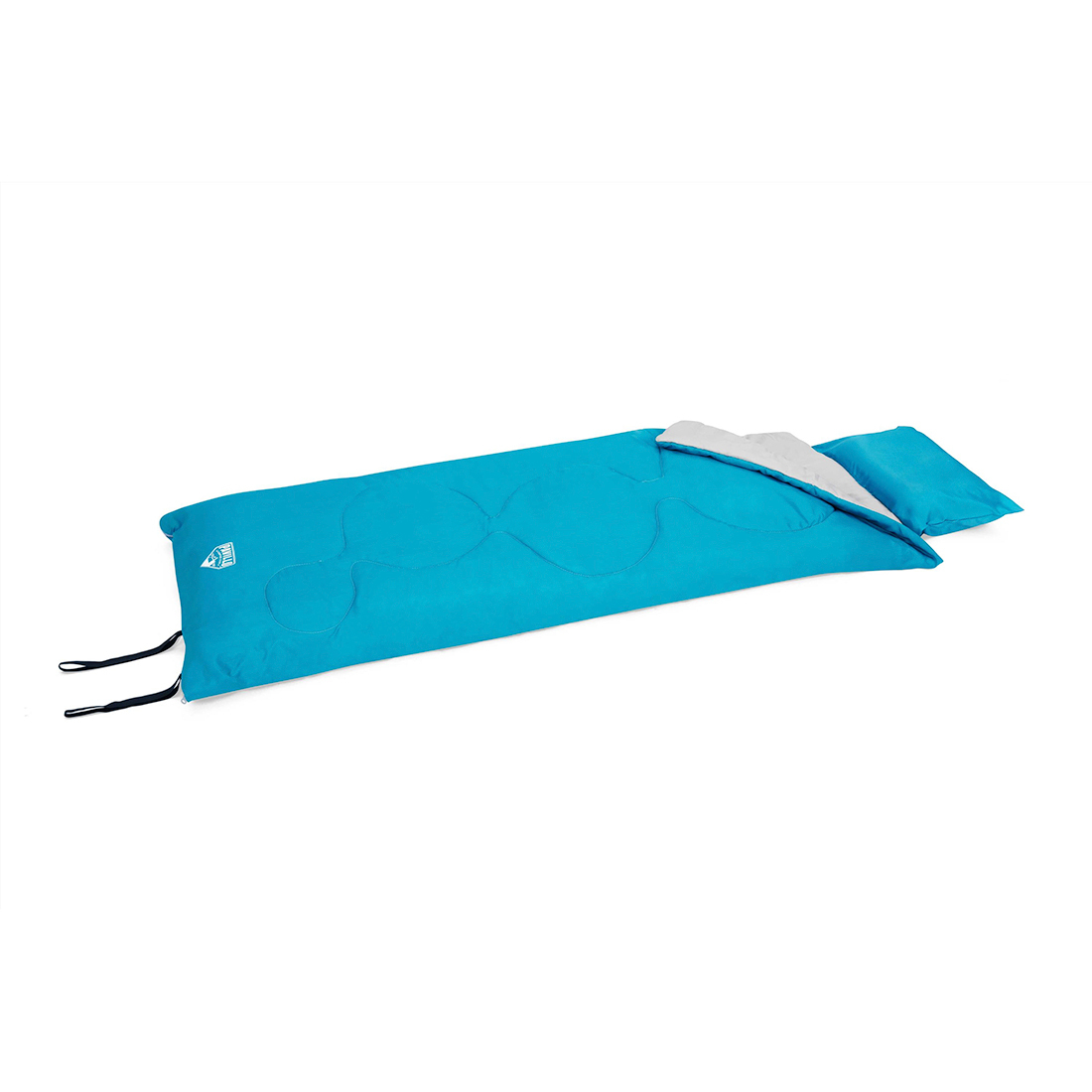 Спальный мешок Bestway Pavillo 68100, 190x84 см, надувная подушка, синий, серый - прекрасное спальное место для турпоходов, экспедиций, прогулок на лоне природы. Приятный телу прочный материал обеспечивает полную защиту от дождя, ветра. Полиэстер обладает прочностью, долго сохраняет свои свойства. Подкладка из понжи (Pongee) мягкая, наполнитель из волокна Hollowfiber обеспечивает сохранение тепла.Имеет в комплекте подушку и чехол.Эластичные ремешки скрепляют свернутый спальный мешок. Благодаря этому свернуть сложить его для транспортировки стало гораздо легче, так что справится даже ребенок.Спальник модели Evade 10 послужит вам не только в походе, но и на даче, и дома, например, если гости остались с ночевкой или одеяло в стирке.