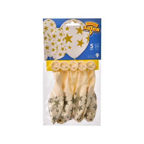 абор шаров из натурального латекса. 5 шаров с шелкографическим рисунком на Звезды золотые на белых перламутровых шарах. Голливуд. В упаковке с хедером Весёлая Затея - идеальное решение для продажи воздушных шариков в магазине самообслуживания. Шары в упаковке зафиксированы на специальной планке. Благодаря этому хорошо виден рисунок. Наборы удобны для размещения на торговом оборудовании в зале и в прикассовой зоне магазина. Воздушные шары изготавливаются из экологически безопасного 100%-ного натурального латекса. В окружающей среде разлагаются на безопасные компоненты примерно с той-же скоростью, как обычные листья деревьев. После использования лопнуть и утилизировать как бытовой отход. Квант поставки 1 блок - 10 пакетов